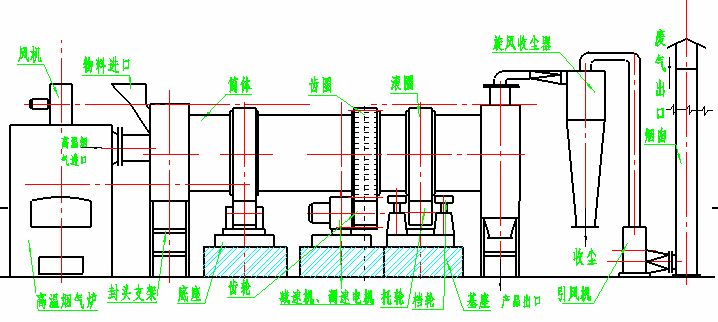 干燥的濕物料由皮帶輸送機(jī)或斗式提升機(jī)送到料斗,然后經(jīng)料斗的加料機(jī)通過加料管道進(jìn)入加料端。加料管道的斜度要大于物料的自然傾角,以便物料順利流入干燥器內(nèi)。干燥器圓筒是一個與水平線略成傾斜的旋轉(zhuǎn)圓筒。物料從較高一端加入,載熱體由低端進(jìn)入,與物料成逆流接觸,也有載熱體和物料一起并流進(jìn)入筒體的。隨著圓筒的轉(zhuǎn)動物料受重力作用運(yùn)行到較底的一端。濕物料在筒體內(nèi)向前移動過程中,直接或間接了載熱體的給熱,使?jié)裎锪系靡愿稍铮缓笤诔隽隙私?jīng)皮帶機(jī)或螺旋輸送機(jī)送出。在筒體內(nèi)壁上裝有抄板,它的作用是把物料抄起來又撒下,使物料與氣流的接觸表面增大,以提高干燥速率并促進(jìn)物料前進(jìn)。載熱體一般分為熱空氣、煙道氣等。載熱體經(jīng)干燥器以后,一般需要旋風(fēng)除塵器將氣體內(nèi)所帶物料捕集下來。如需進(jìn)一步減少尾氣含塵量,還應(yīng)經(jīng)過袋式除塵器或濕法除塵器后再放排放。
