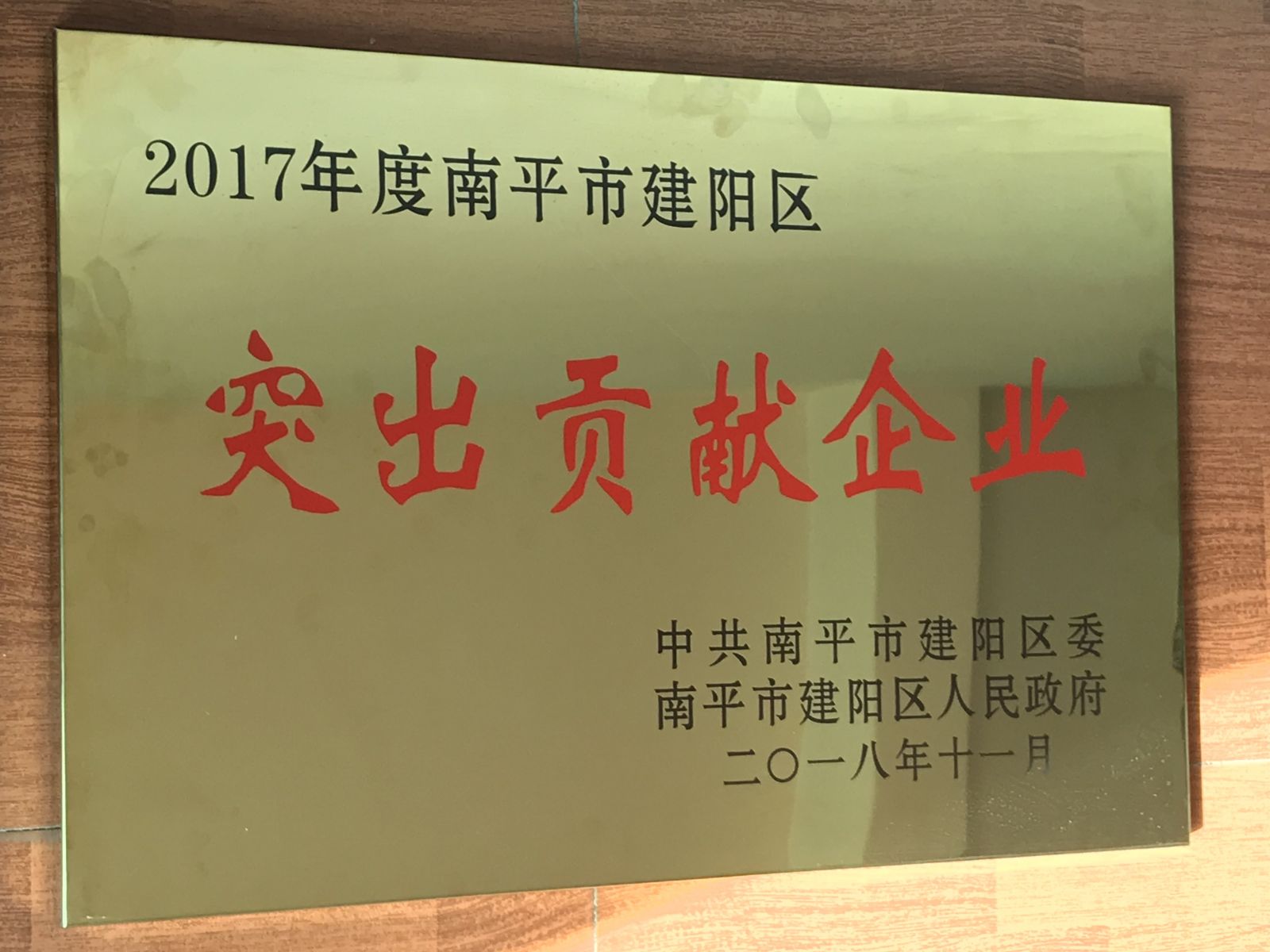 2018年11月22日下午,建陽區(qū)召開2018年度工業(yè)發(fā)展會(huì)議。我公司等12家企業(yè)被授予“2017年度建陽區(qū)突出貢獻(xiàn)企業(yè)”稱號(hào),予以全區(qū)表揚(yáng)并頒發(fā)牌匾。